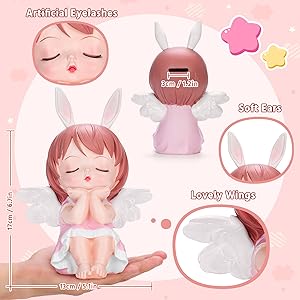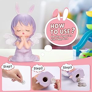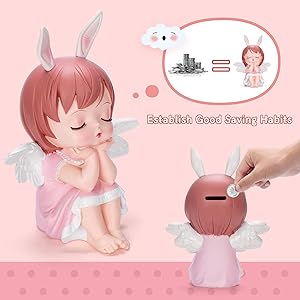 - 【Learn Saving】This kids coin bank safe will be the best buddy when you teach children to save money. It's the perfect starting point for a meaningful financial journey about money management and responsibility. Add your baby's first coins to this sweet and enchanting angel piggy bank.